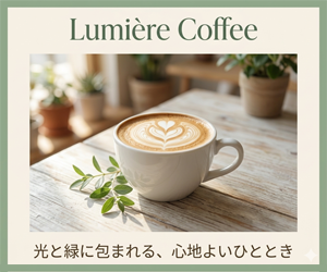 架空のカフェ「Lumière Coffee」のWebサイトと広告バナー3種を制作しました。グリーン×ベージュのナチュラルなトンマナで統一し、20〜30代女性をターゲットにデザインしています。